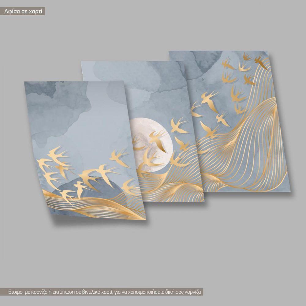 Golden abstract lines and birds, αφίσα, κάδρο τρίπτυχο