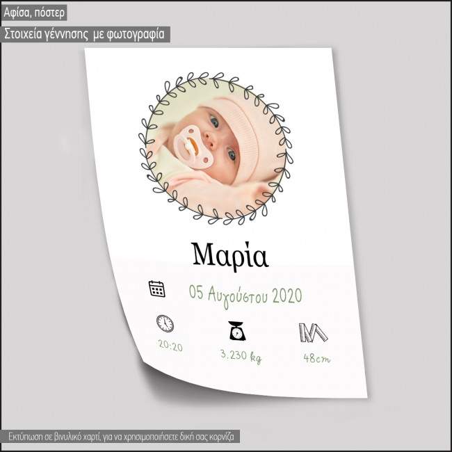 Η φωτογραφία του μωρού σας, όνομα, ημερομηνία, βάρος, ύψος