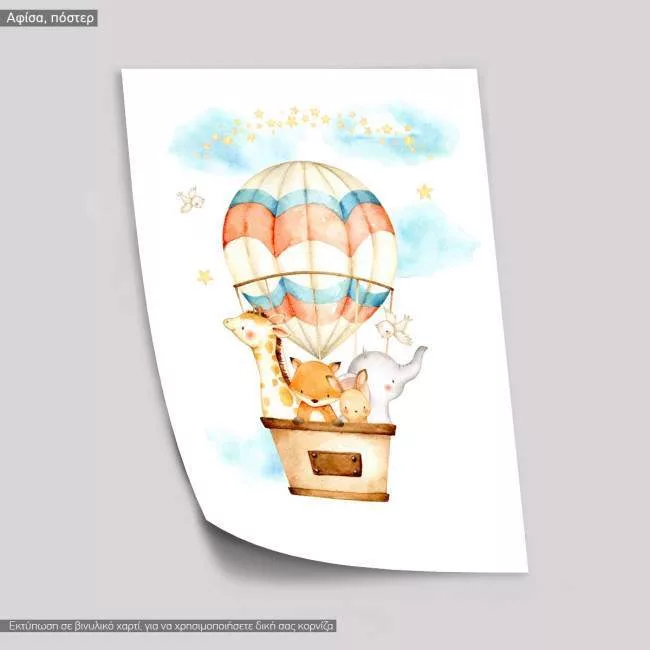 Αερόστατο χαριτωμένα ζωάκια art I watercolor, αφίσα, κάδρο