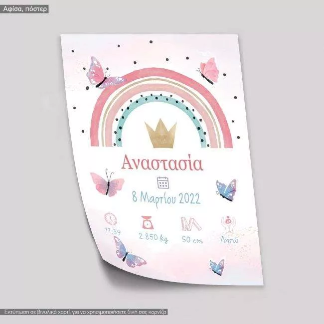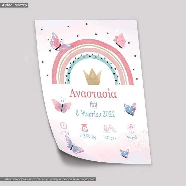 Ουράνιο τόξο και πεταλούδες με στοιχεία γέννησης, αφίσα, κάδρο
