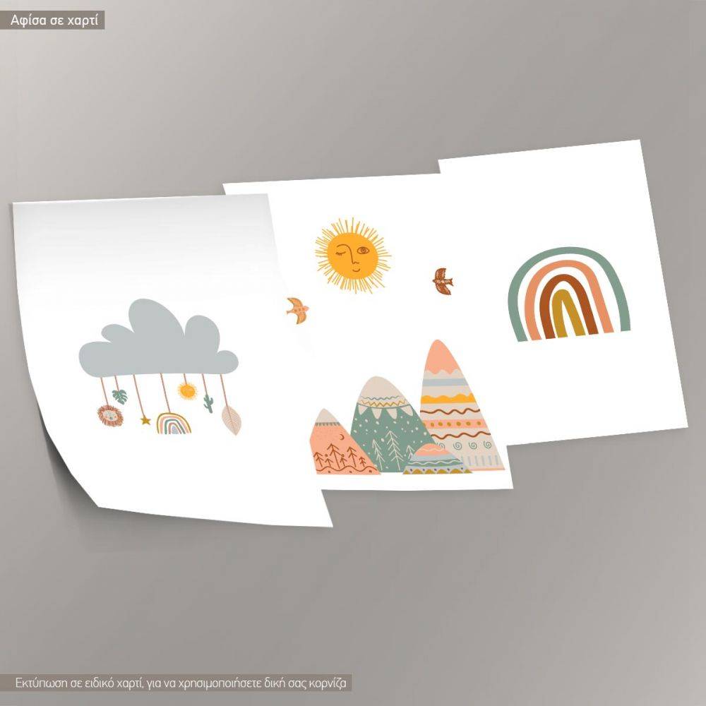 Παιχνιδιάρικο σύννεφο, Βουνά, Ουράνιο τόξο Boho, αφίσα, κάδρο