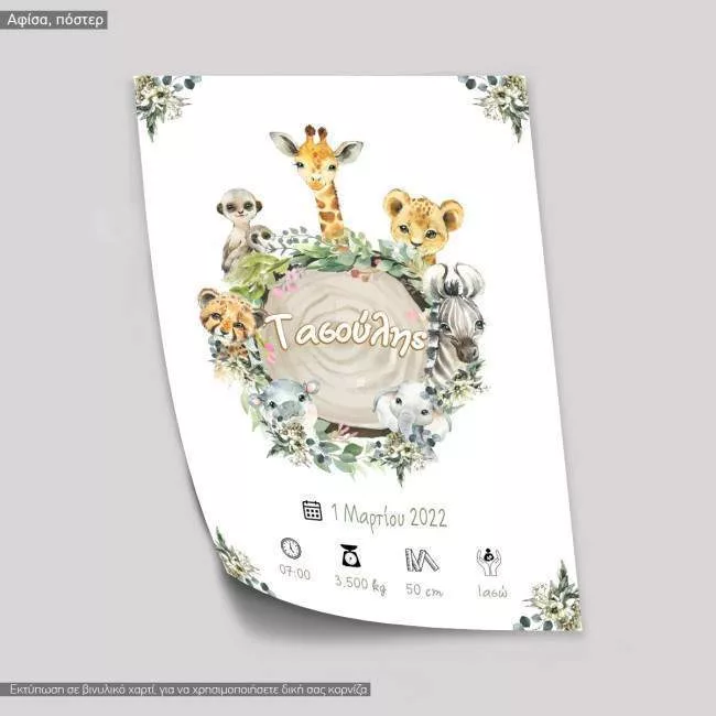 Ζωάκια ζούγκλας σε κορμό με στοιχεία γέννησης, αφίσα, κάδρο