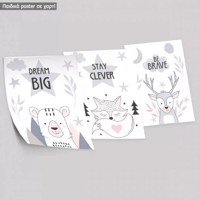 Dream Big, με αρκουδάκι, αλεπού, ελάφι, αφίσα, κάδρο, τρίπτυχο