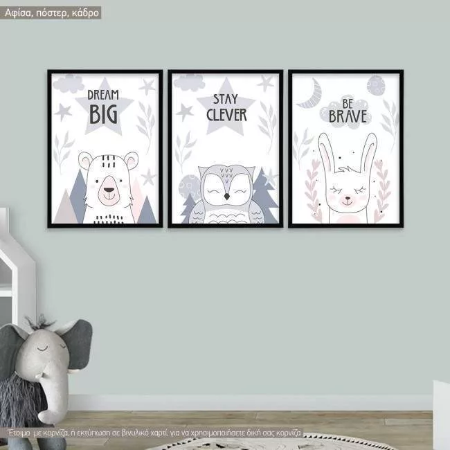 Dream Big, αρκουδάκι, κουκουβάγια, λαγός, αφίσα, κάδρο, τρίπτυχο
