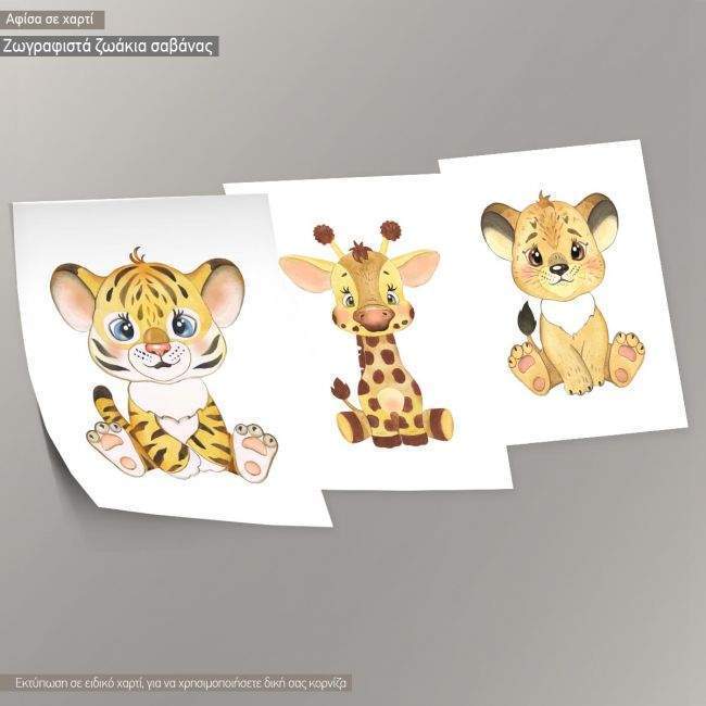 Ζωάκια σαβάνας ζωγραφιστά, αφίσα, κάδρο, τρίπτυχη