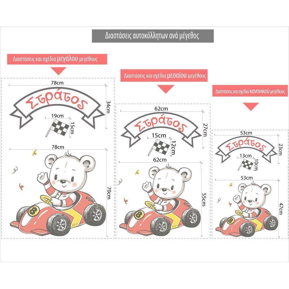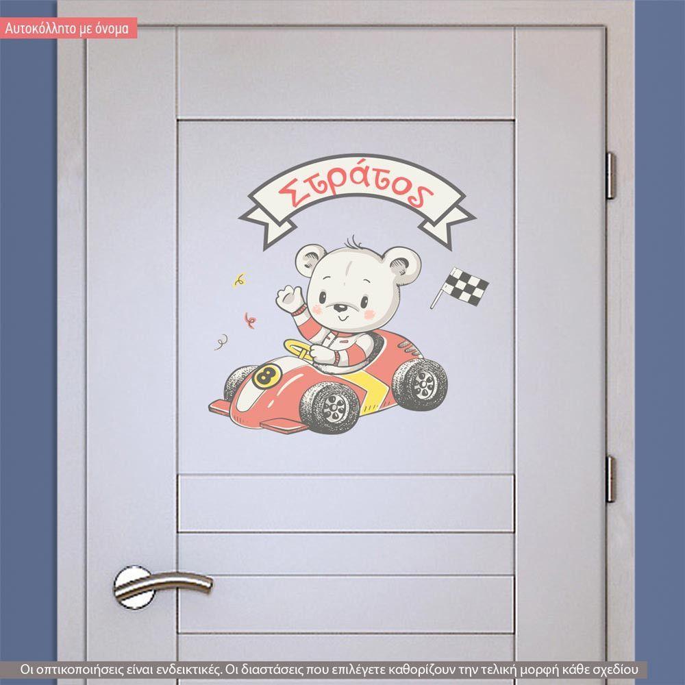 Αυτοκόλλητα τοίχου παιδικά Αρκουδάκι αγωνιστικό αυτοκίνητο με όνομα