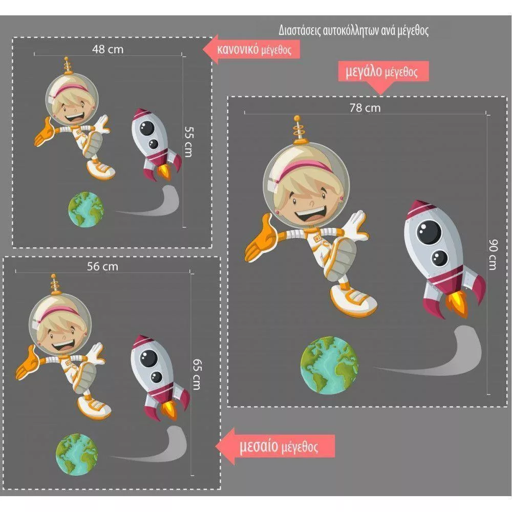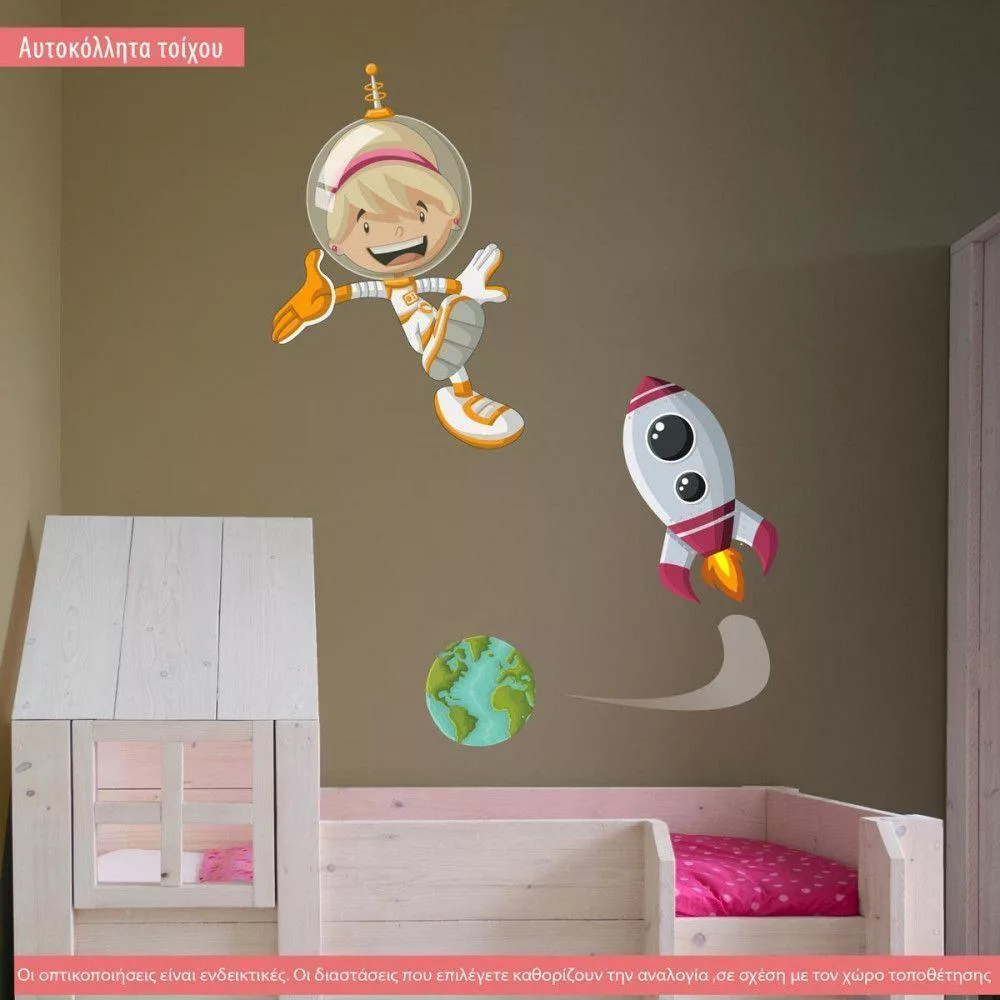 Αυτοκόλλητα τοίχου παιδικά Αστροναύτης κοριτσάκι, πύραυλος και υδρόγειος