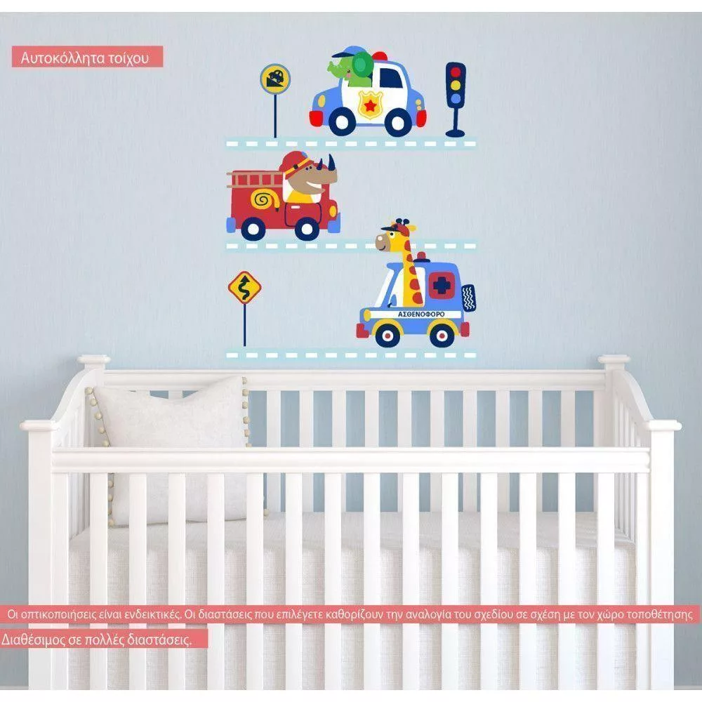 Αυτοκόλλητο τοίχου ζωάκια, περιπολικό, ασθενοφόρο και πυροσβεστικό, Ομάδα Άμεσης Επέμβασης