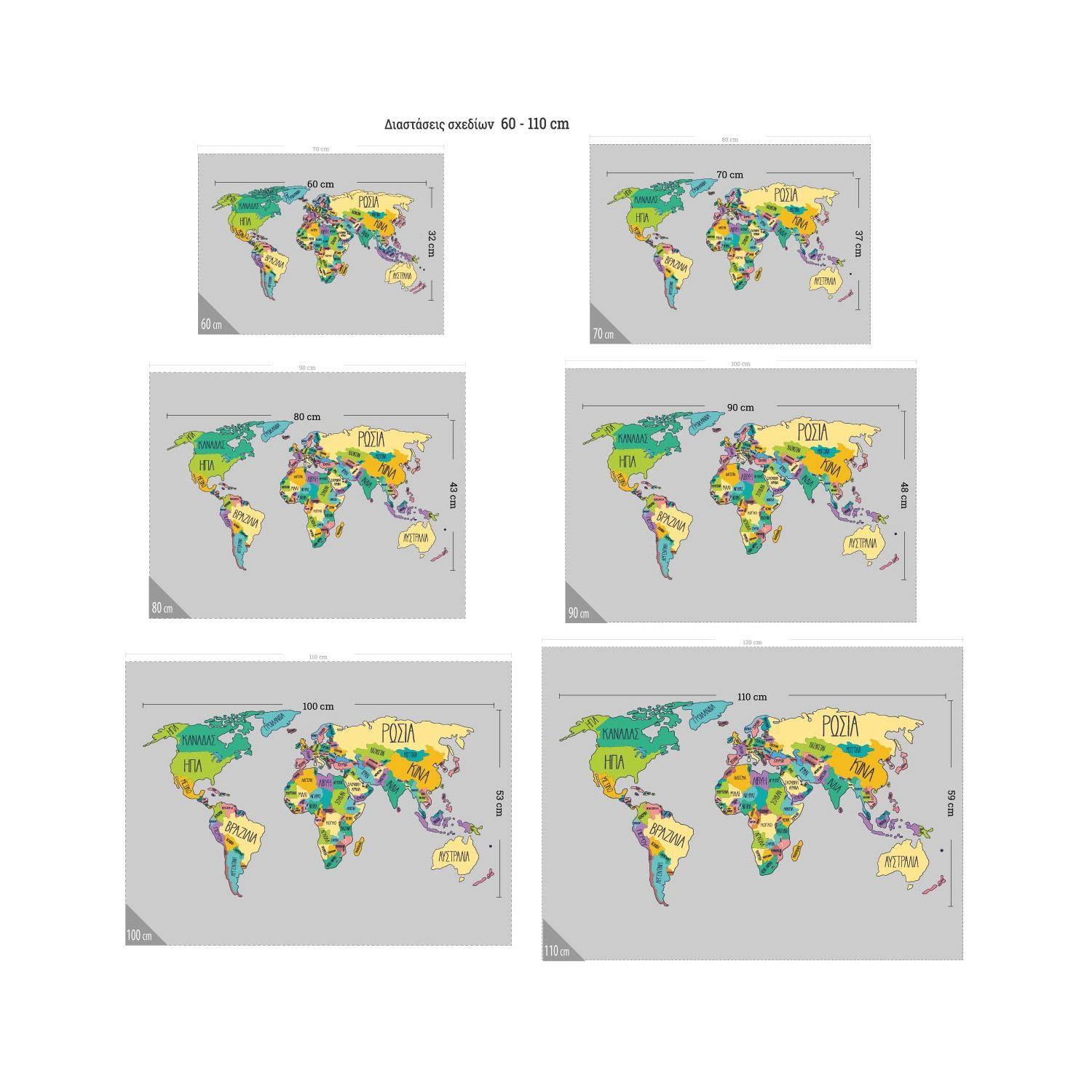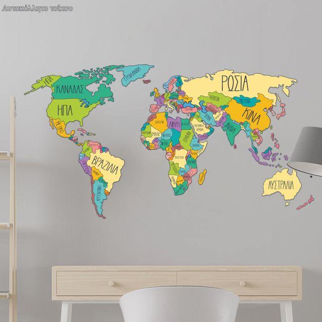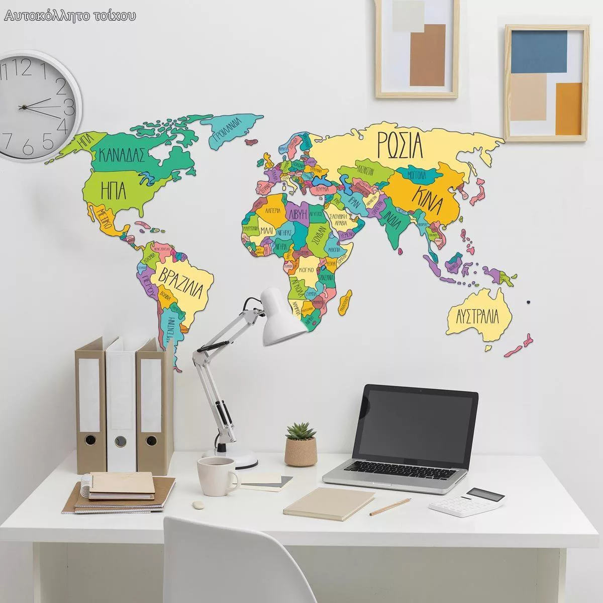Διακοσμητικό αυτοκόλλητο τοίχου με χάρτη που περιλαμβάνει τα ονόματα των χωρών, όλα γραμμένα στα Ελληνικά.