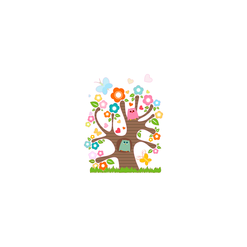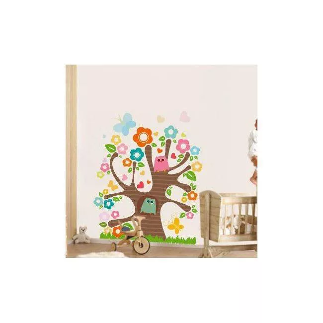 Αυτοκόλλητο τοίχου δέντρο, κουκουβάγιες, λουλούδια, Χαρούμενο δέντρο