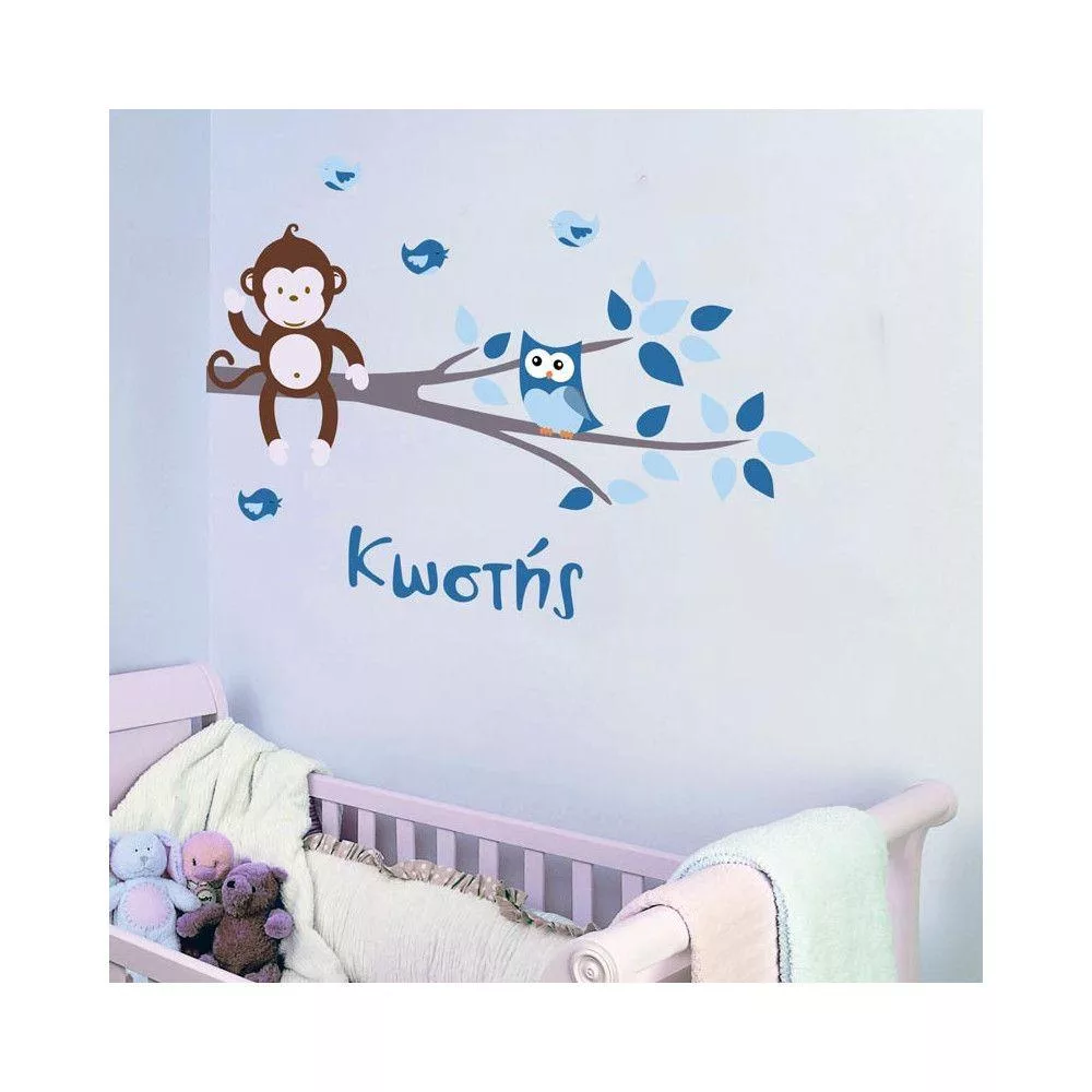 Αυτοκόλλητα τοίχου παιδικά μαϊμού, κουκουβάγια και πουλάκια, Hello! (Blue), με όνομα