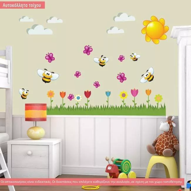 Αυτοκόλλητο τοίχου Μελισσούλες, λουλούδια, ροζ πεταλούδες