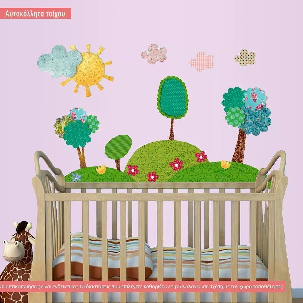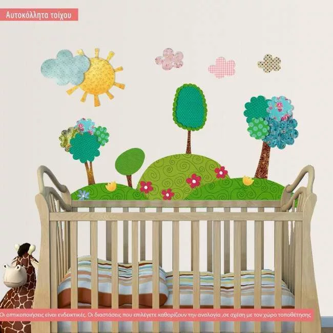 Αυτοκόλλητα τοίχου παιδικά Τοπίο με μοτίβα, δέντρα, λόφοι και ήλιος