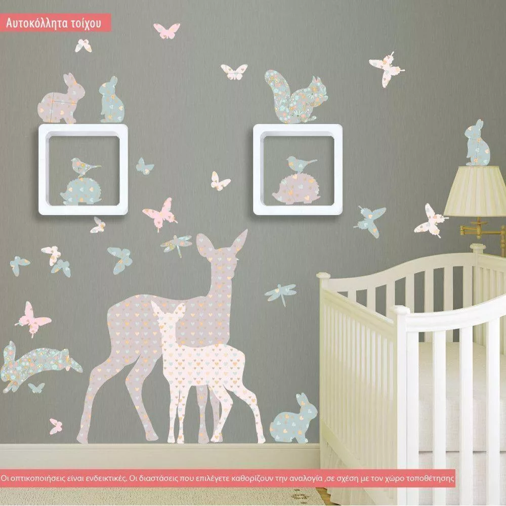 Αυτοκόλλητα τοίχου παιδικά Ζωάκια του δάσους με μοτίβα floral, ολόκληρη παράσταση