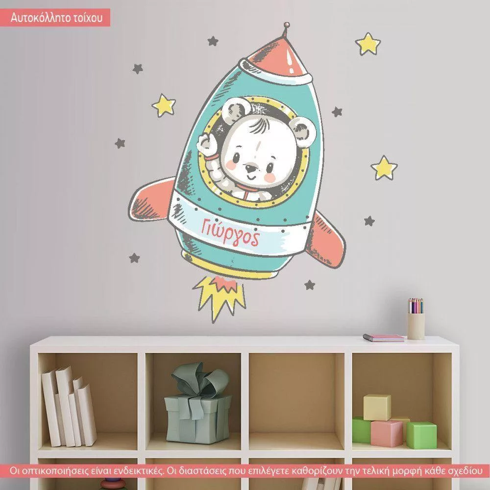 Αυτοκόλλητα τοίχου παιδικά Αρκουδάκι σε πύραυλο με όνομα
