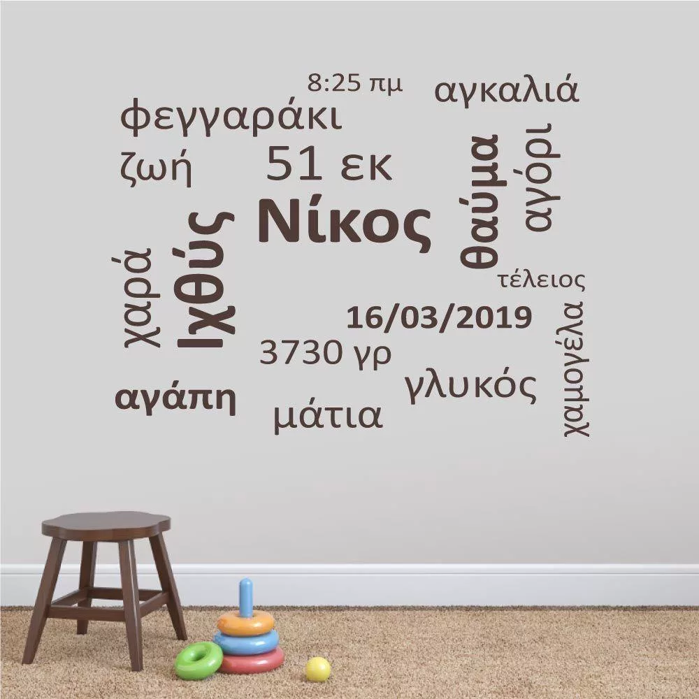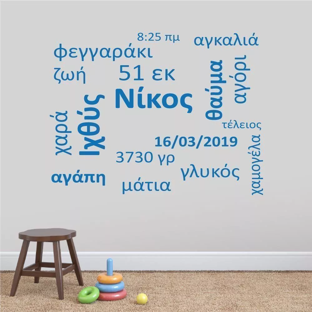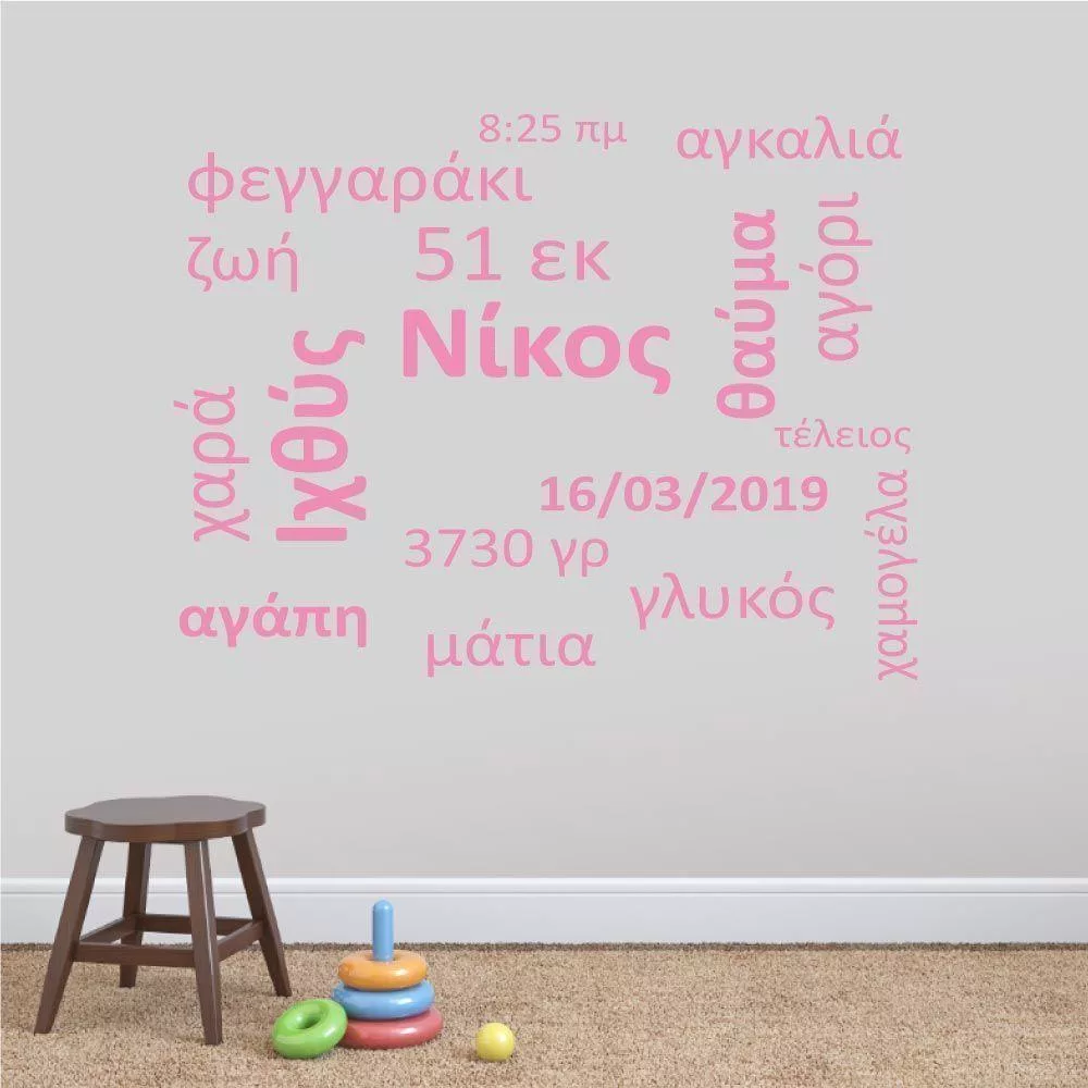 Αυτοκόλλητα τοίχου παιδικά λέξεις, όνομα, ημερομηνία, ζώδιο, Baby word cloud