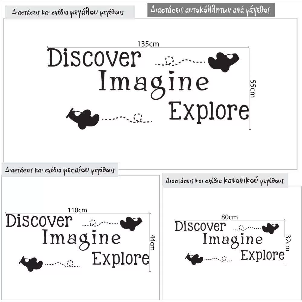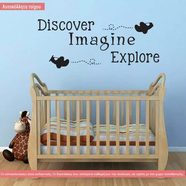 Αυτοκόλλητα τοίχου παιδικά με ευχή και αεροπλανάκια, Discover, imagine, explore