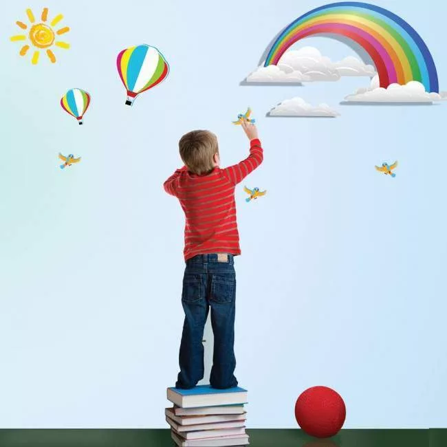 Αυτοκόλλητο τοίχου Ουράνιο τόξο, αερόστατα, ήλιος και πουλιά