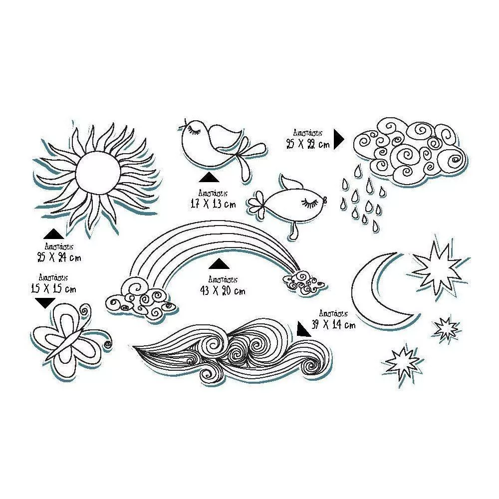 Αυτοκόλλητο τοίχου ήλιος, φεγγάρι, ουράνιο τόξο, σύννεφα και πουλιά, Ρετρό νοσταλγικά σχήματα