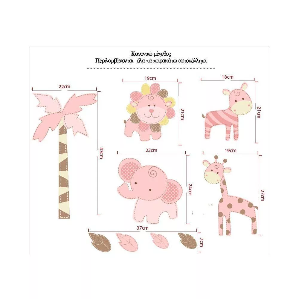 Αυτοκόλλητα τοίχου παιδικά ροζ ζωάκια ζούγκλας , δέντρο και φύλλα, Baby safari (pink)