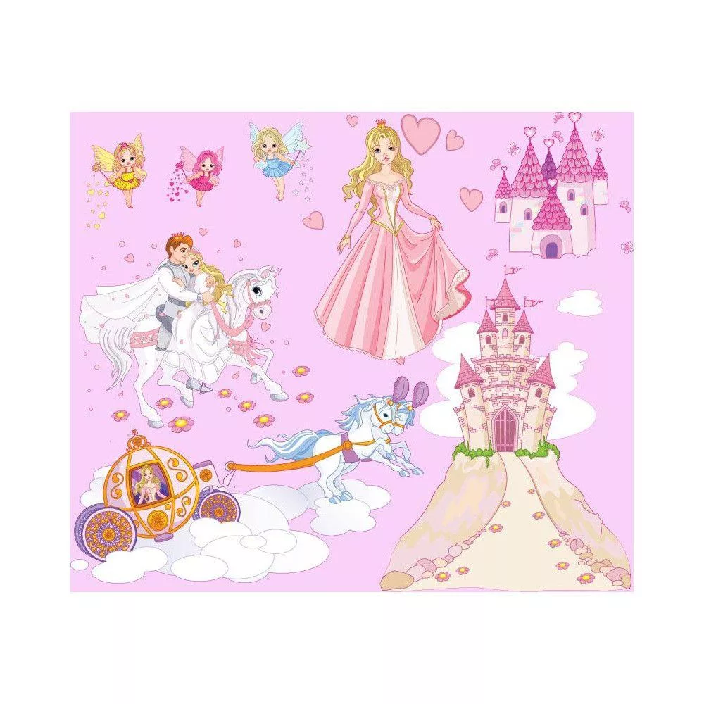 Η πριγκίπισσα φεύγει με την άμαξα από τον πύργο της, οι νεραϊδούλες με τα ραβδάκια κάνουν τα μαγικά τους, συναντάει το πριγκιπόπουλο, και φεύγουν για το κάστρο του. Το παραμύθι ζωντανεύει στον τοίχο της πριγκιπισσά σας!