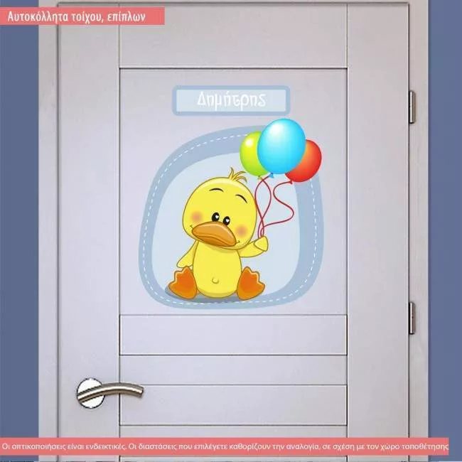 Αυτοκόλλητο τοίχου Χαριτωμένο Παπάκι, πινακίδα με όνομα, μπαλόνια και λουλούδια