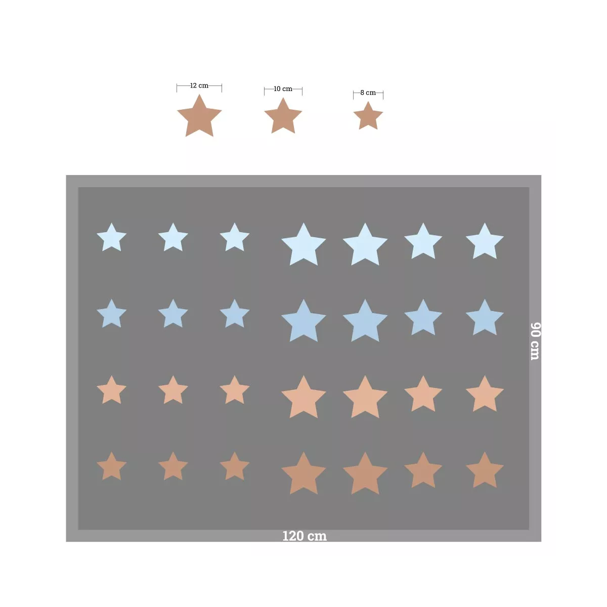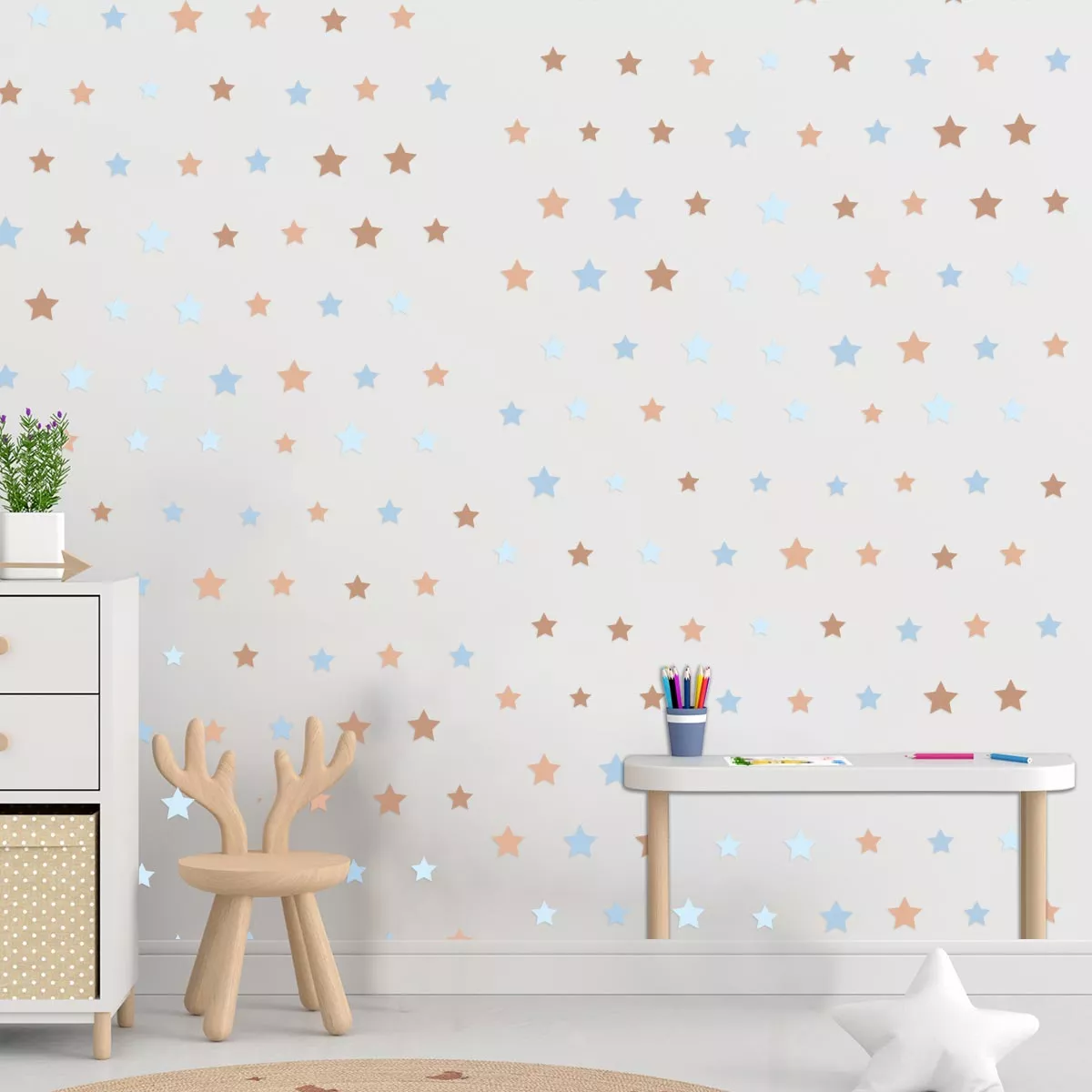 Δώστε την αίσθηση ενός έναστρου ουρανού στο δωμάτιο με αυτό το μίνιμαλ μοτίβο. Τα αυτοκόλλητα αστέρια σε αρμονικούς καφέ και γαλάζιους τόνους δημιουργούν ένα ήρεμο και ονειρικό περιβάλλον, ιδανικό για χαλάρωση και παιχνίδι.