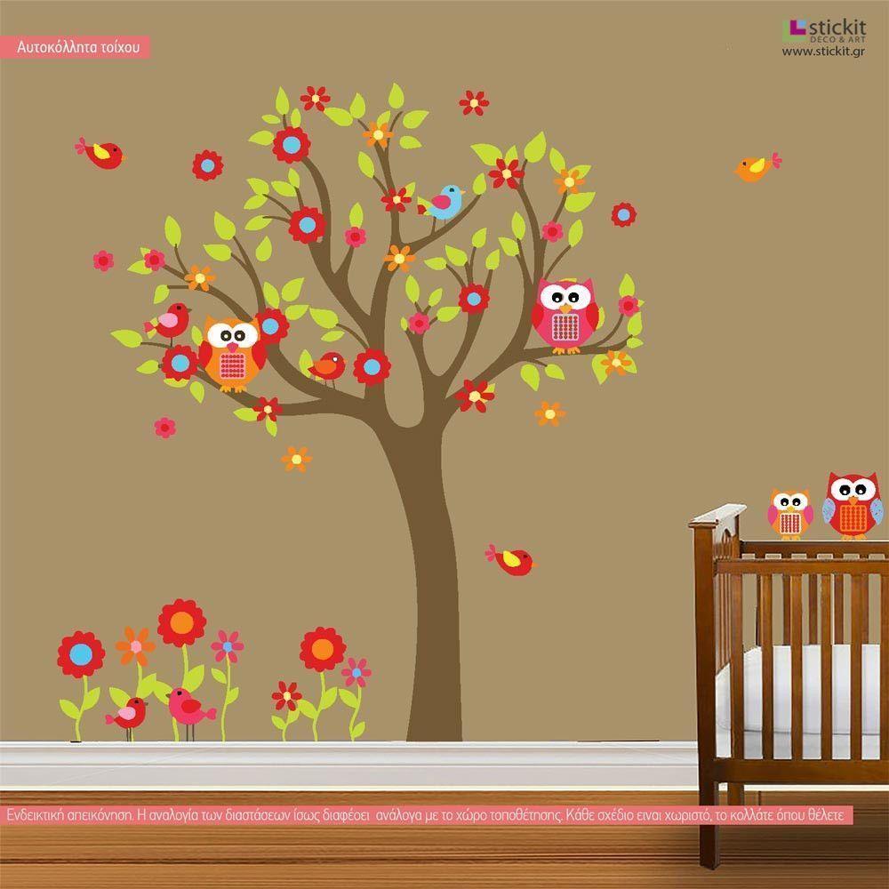 Αυτοκόλλητο τοίχου δέντρο, κουκουβάγιες, λουλούδια και πουλάκια, Happy owls, σχέδιο ii