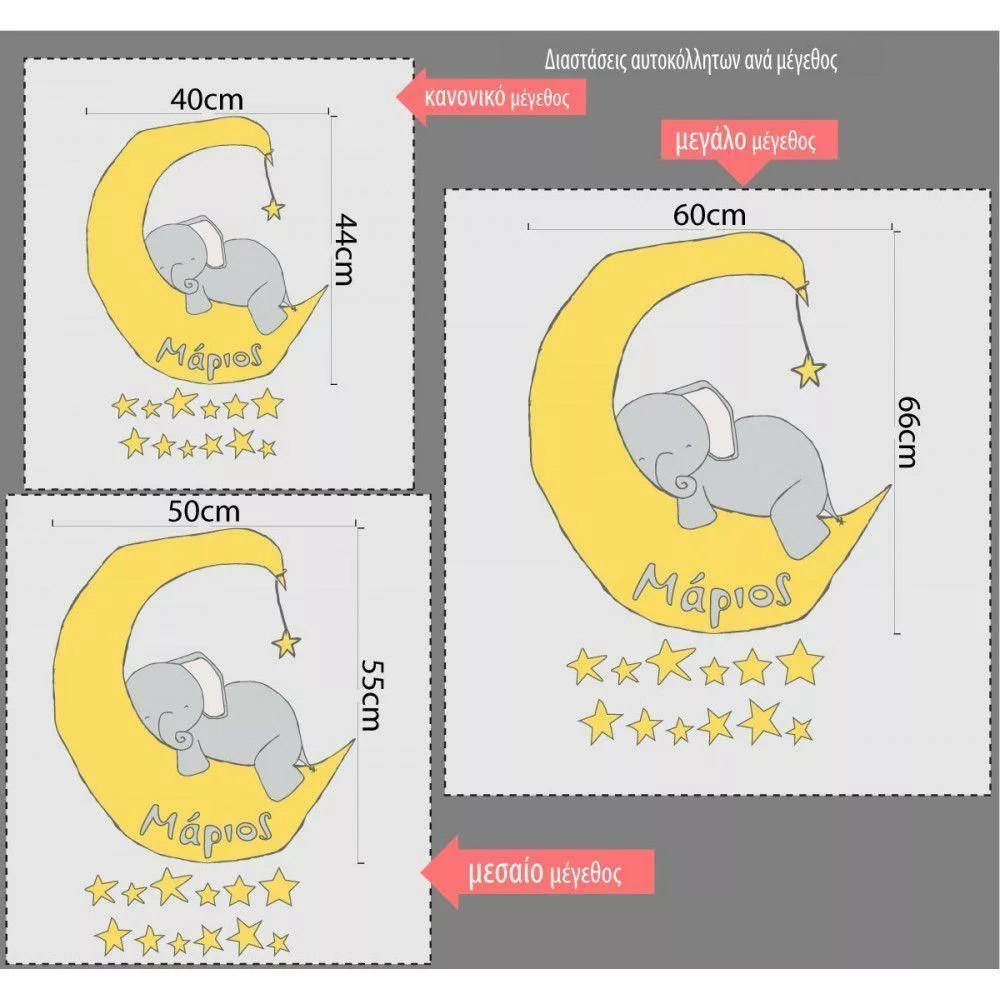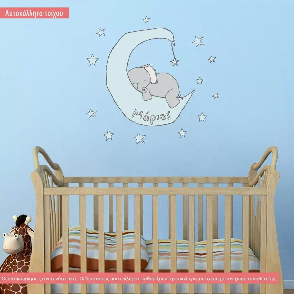 Αυτοκόλλητα τοίχου παιδικά ελεφαντάκι στο φεγγάρι, με όνομα και αστέρια