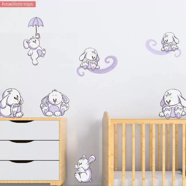 Αυτοκόλλητα τοίχου παιδικά Κουνελάκια παντού μοβ, μεγάλη συλλογή