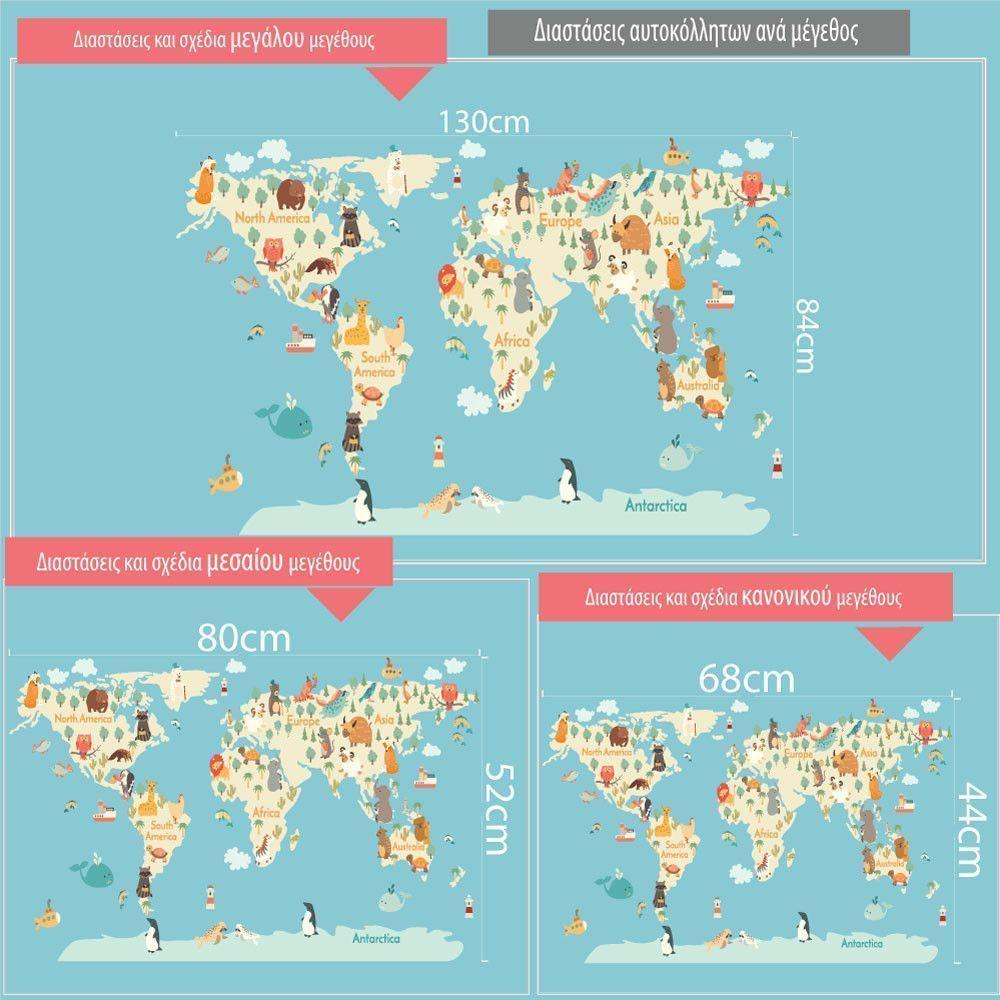 Αυτοκόλλητα τοίχου παιδικά Χάρτης με ζωάκια κάθε ηπείρου, ολόκληρη παράσταση