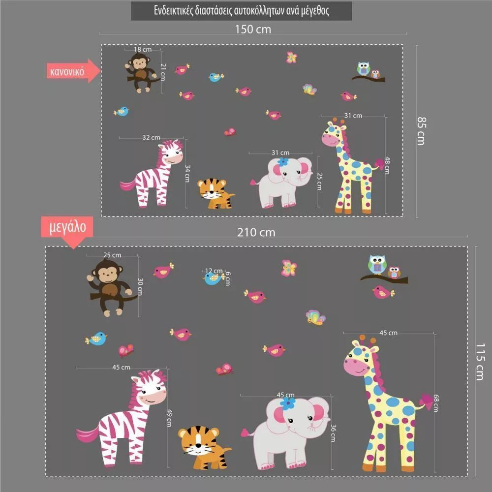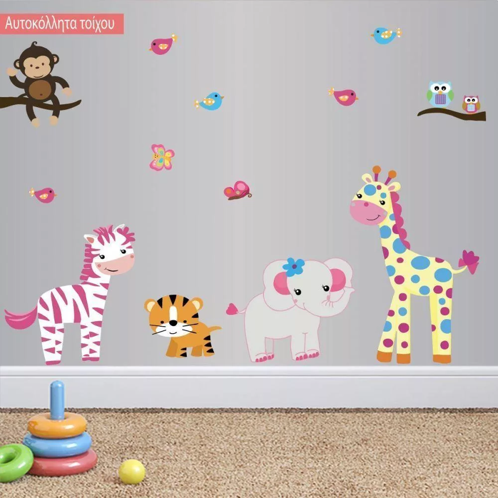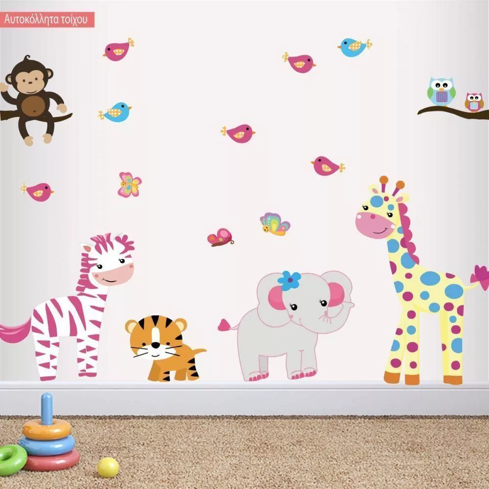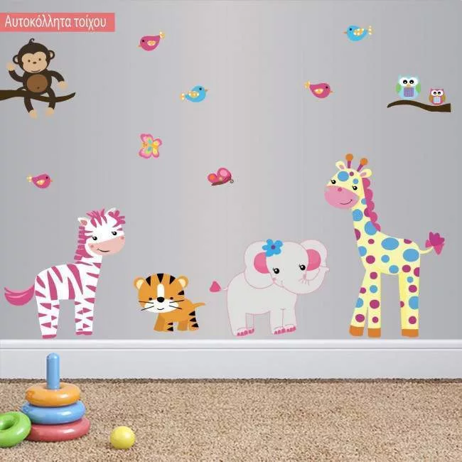 Αυτοκόλλητα τοίχου παιδικά ζωάκια ζούγκλας και λευκό δέντρο, Cute pink Africa (λευκός...