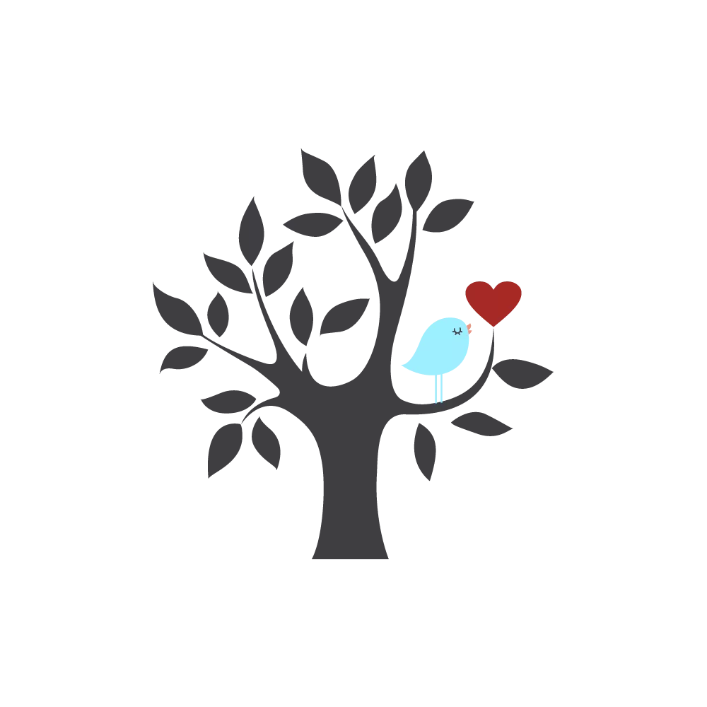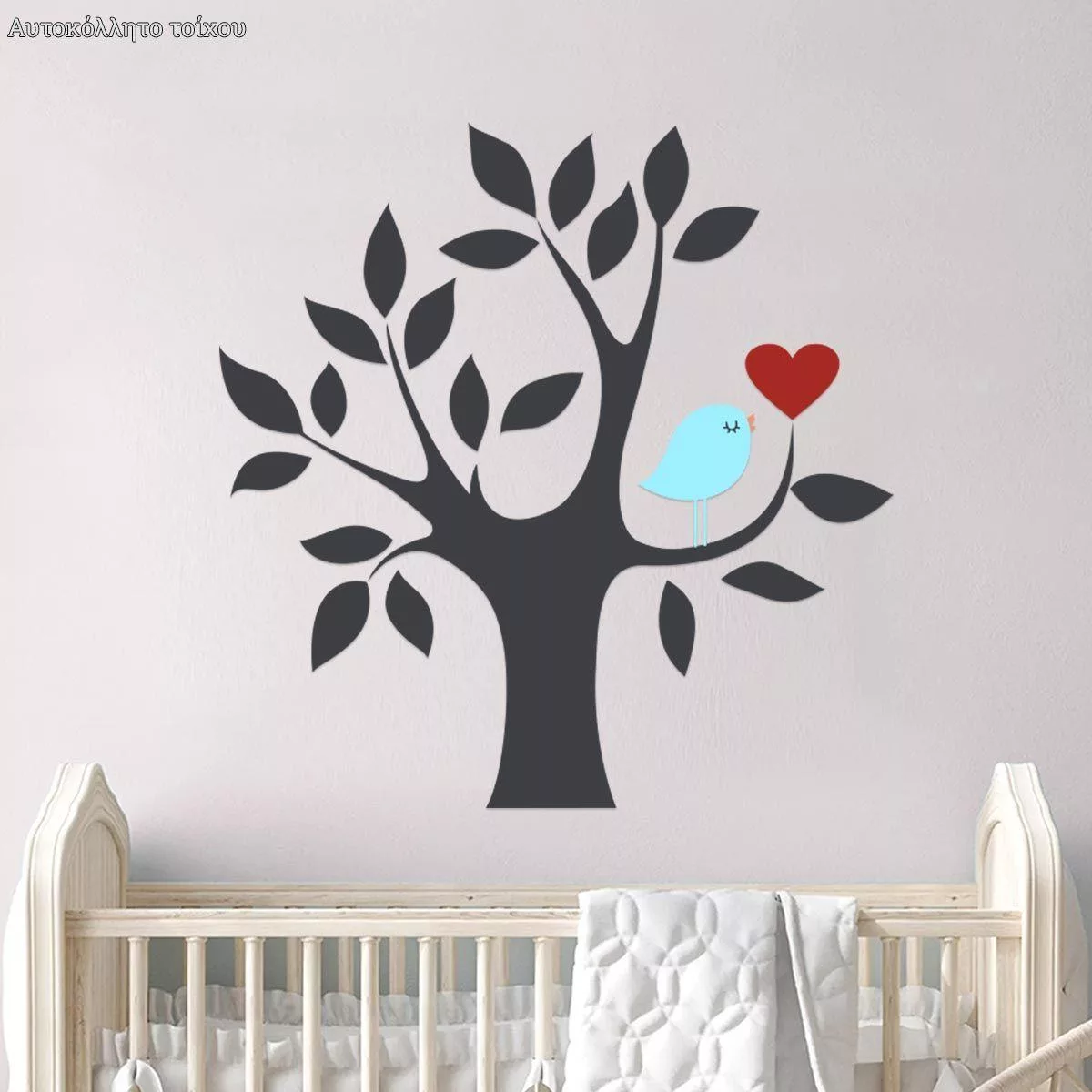 Αυτοκόλλητο τοίχου Δέντρο, καρδιά και πουλί, γκρι μπλε