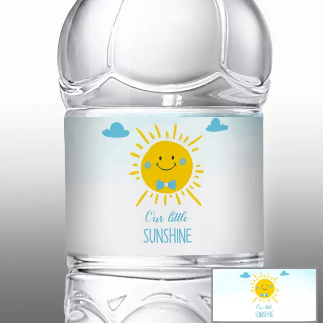 Αυτοκόλλητες ετικέτες με θέμα 'Χαρούμενος Ήλιος', ιδανικές για μπουκάλια νερού και μπομπονιέρες στη βάπτιση του αγοριού σας.