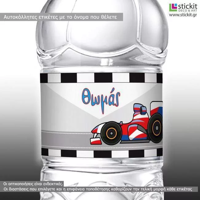 Αυτοκόλλητη ετικέτα Formula 1 cartoon car, με όνομα και ημερομηνία
