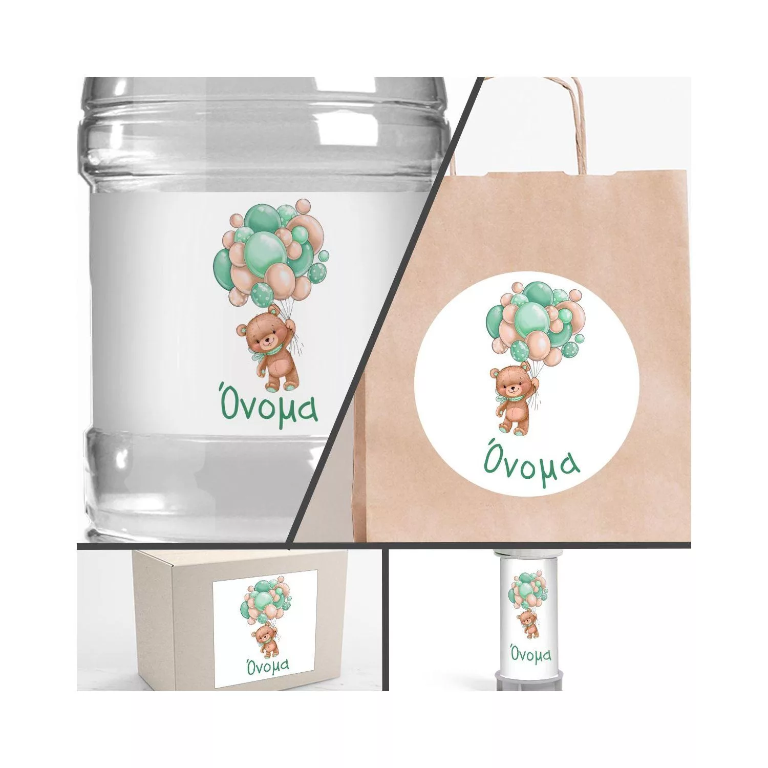 Αυτοκόλλητη ετικέτα Ιπτάμενο αρκουδάκι με πράσινα μπαλόνια