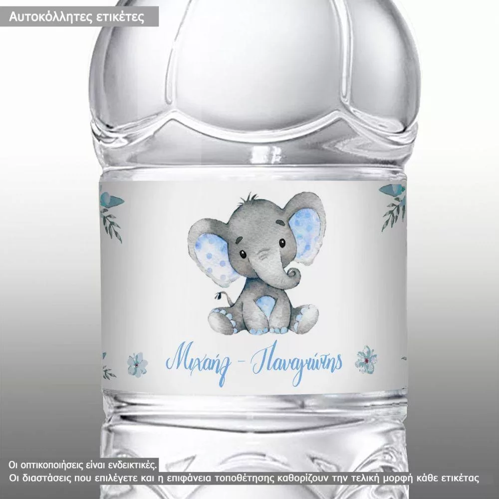 Αυτοκόλλητη ετικέτα Ελεφαντάκι μπλε με λουλούδια 2, με όνομα και ημερομηνία