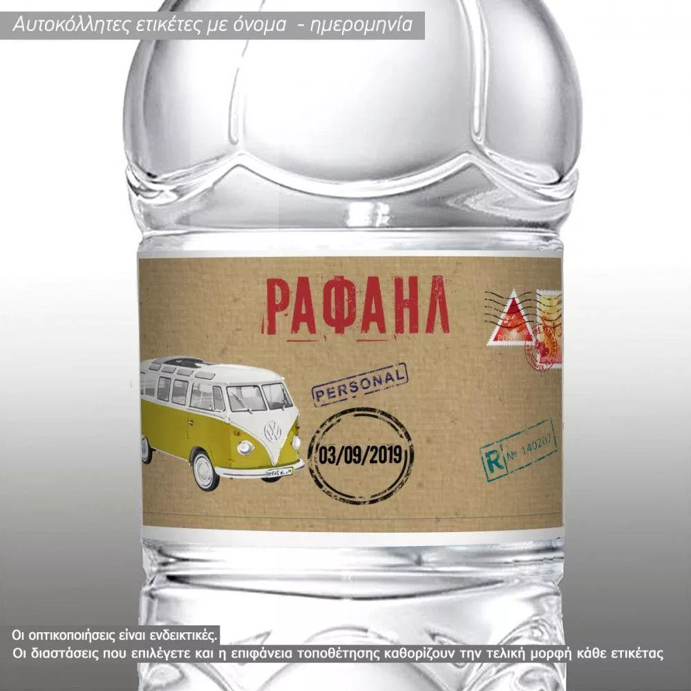 Αυτοκόλλητη ετικέτα Vintage VW bus, με όνομα και ημερομηνία