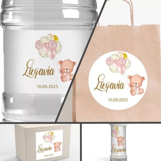 Αυτοκόλλητη ετικέτα Χαριτωμένο αρκουδάκι ροζ χρυσαφιά μπαλόνια