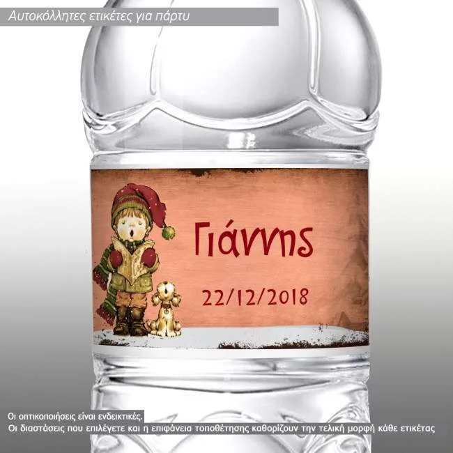 Αυτοκόλλητη Χριστουγεννιάτικη ετικέτα, Αγοράκι και σκυλάκι , κάλαντα, με όνομα και ημερομηνία