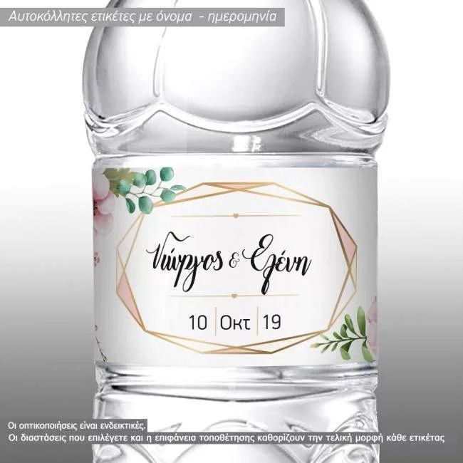 Αυτοκόλλητη ετικέτα γάμου Γεωμετρικά σχήματα και λουλούδια, όνομα ημερομηνία