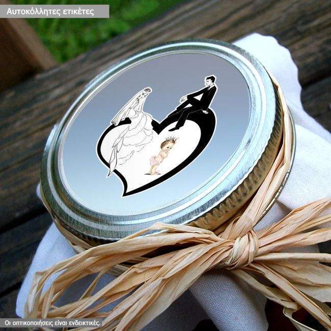 Αυτοκόλλητη ετικέτα ζευγάρι σε καρδιά με μωρό, όνομα και ημερομηνία