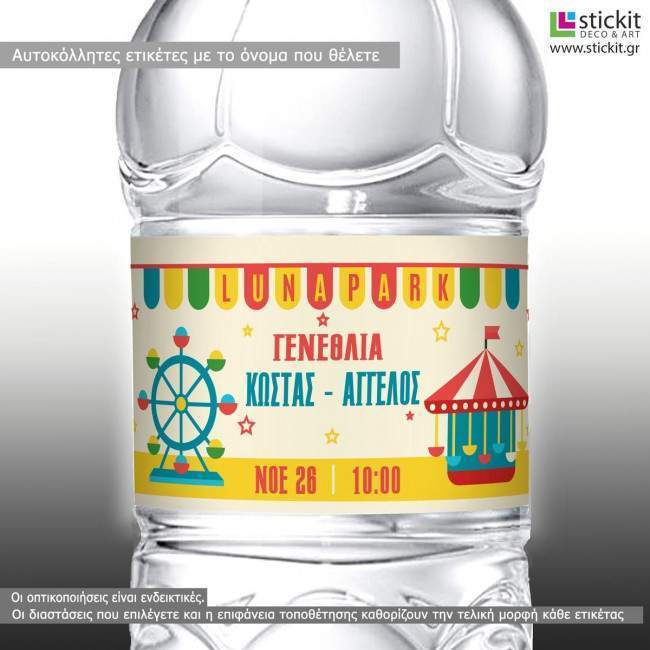 Αυτοκόλλητη ετικέτα Λουνα παρκ, με όνομα και ημερομηνία
