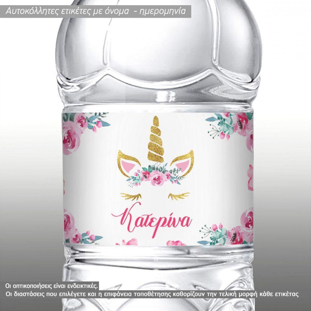 Αυτοκόλλητη ετικέτα Μονόκερος με λουλούδια watercolor, με όνομα και ημερομηνία