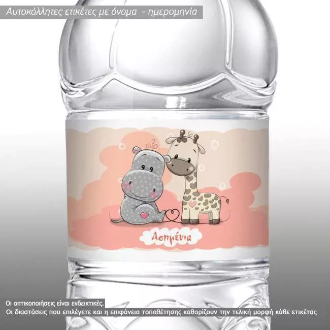 Αυτοκόλλητη ετικέτα Χαριτωμένη καμηλοπάρδαλη και ιπποπόταμος, με όνομα και ημερομηνία