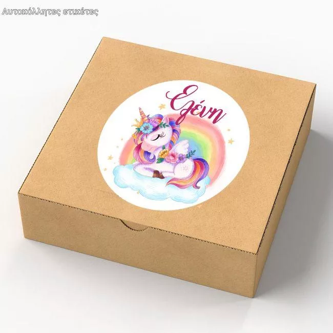 Αυτοκόλλητη ετικέτα ζωγραφιστός μονόκερος, με όνομα και ημερομηνία