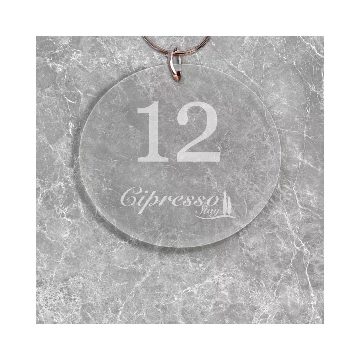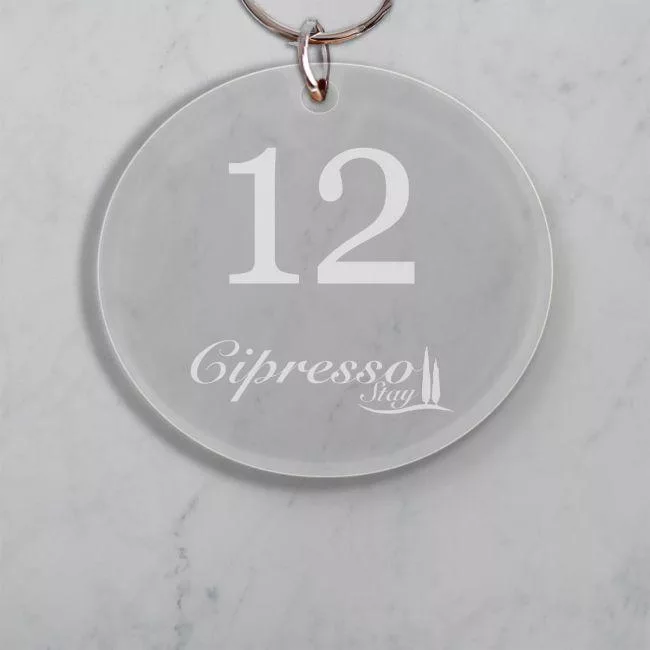 Plexiglass μπρελόκ διάφανο κυκλικό, προσωποποιημένο με χάραξη αριθμών και λογότυπο