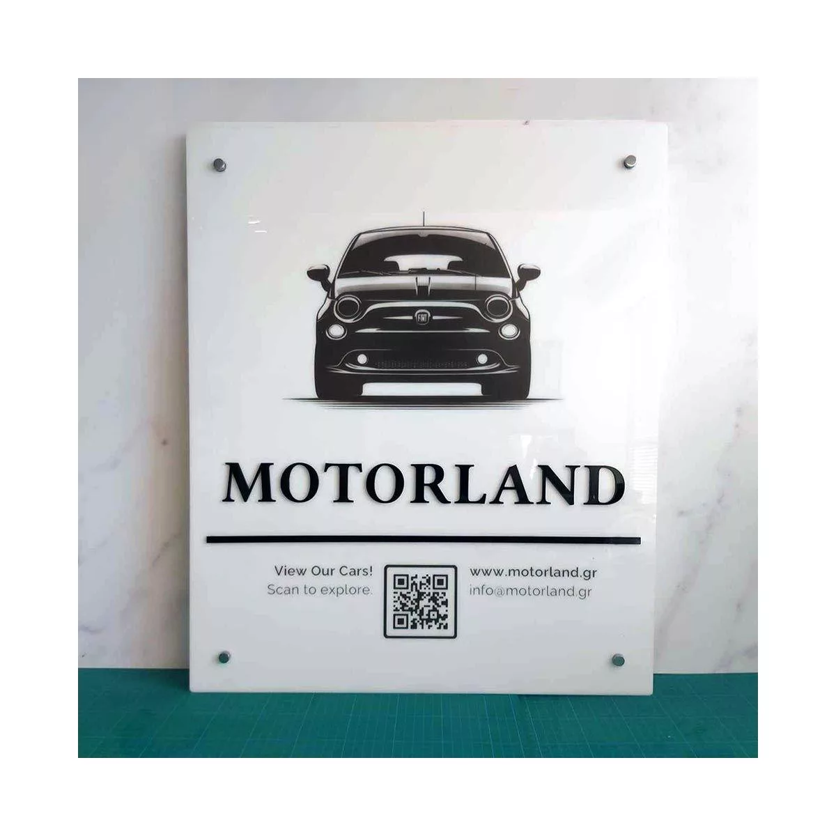 Πινακίδα εκτύπωση σε λευκό plexiglass, κοπή λογότυπου. κειμένου με laser.