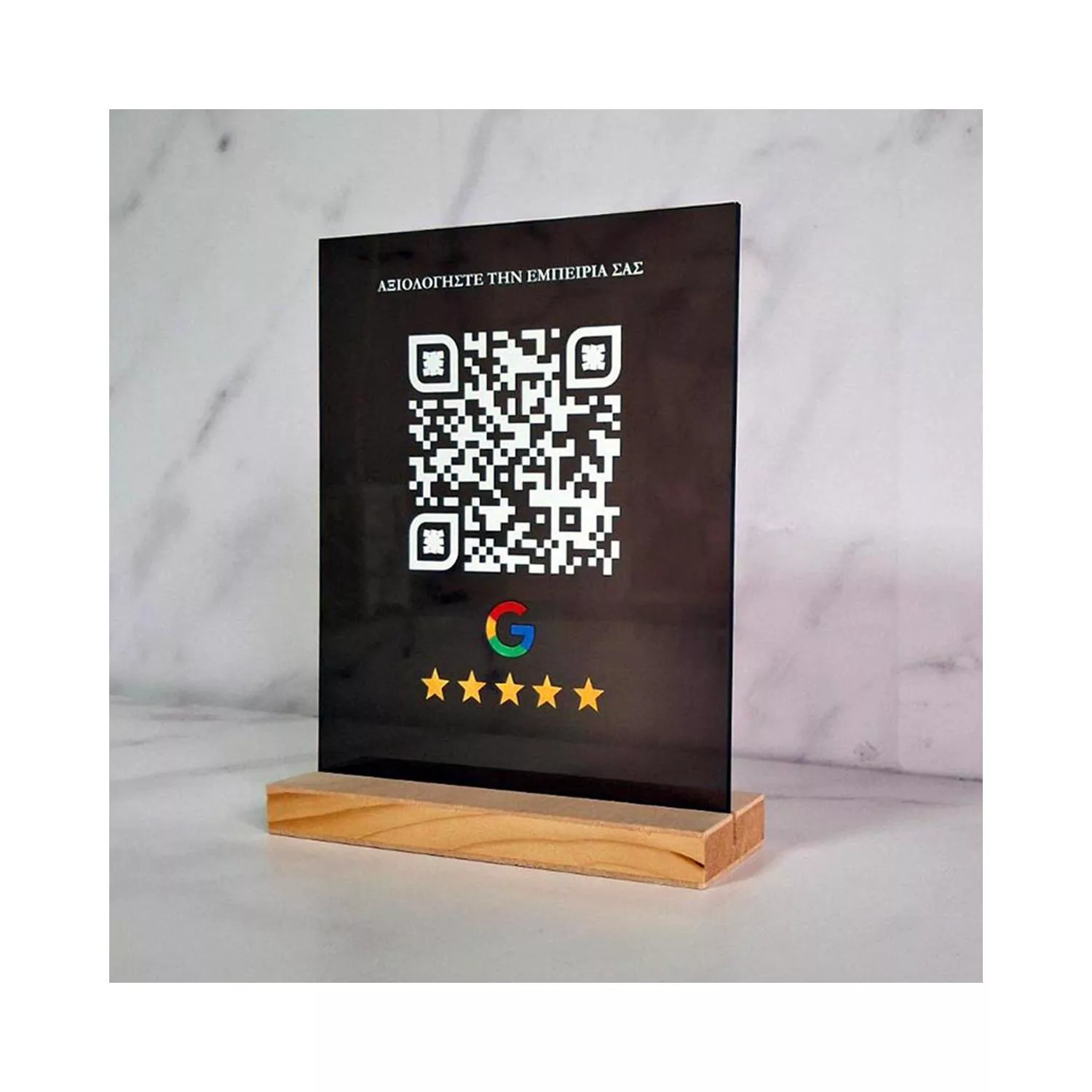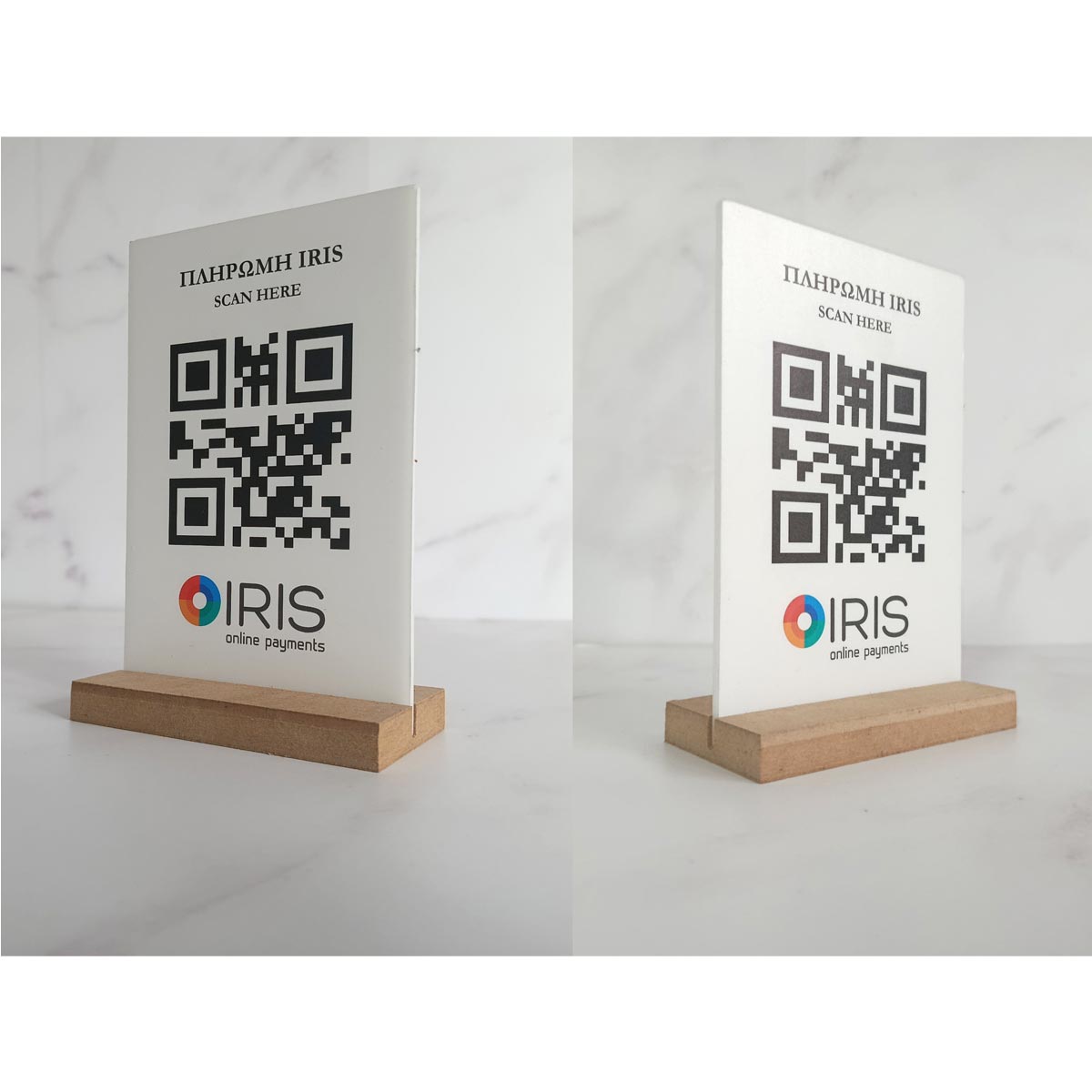 Stand plexiglass ημιδιάφανο φουμέ, με εκτύπωση QR code, rate us at Google