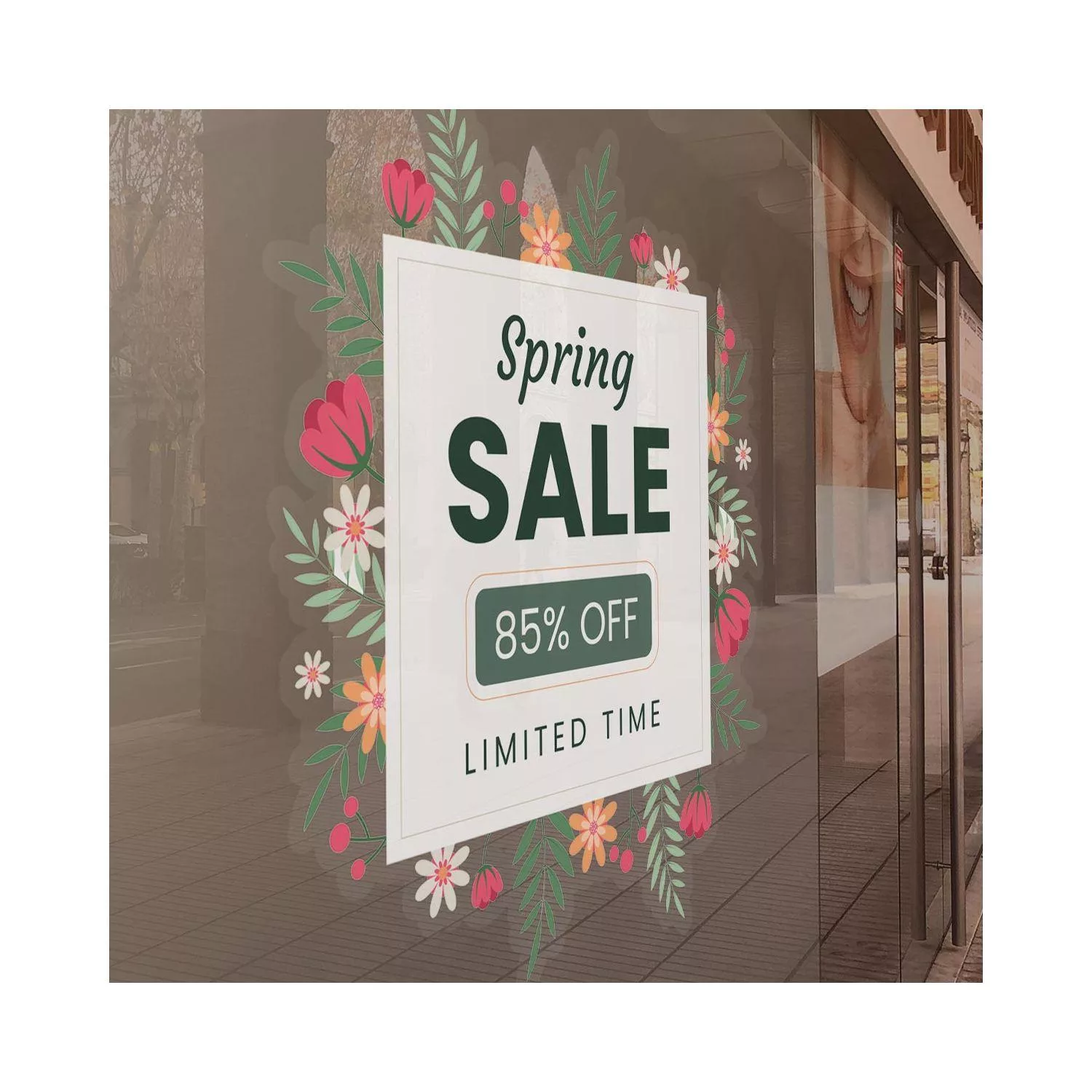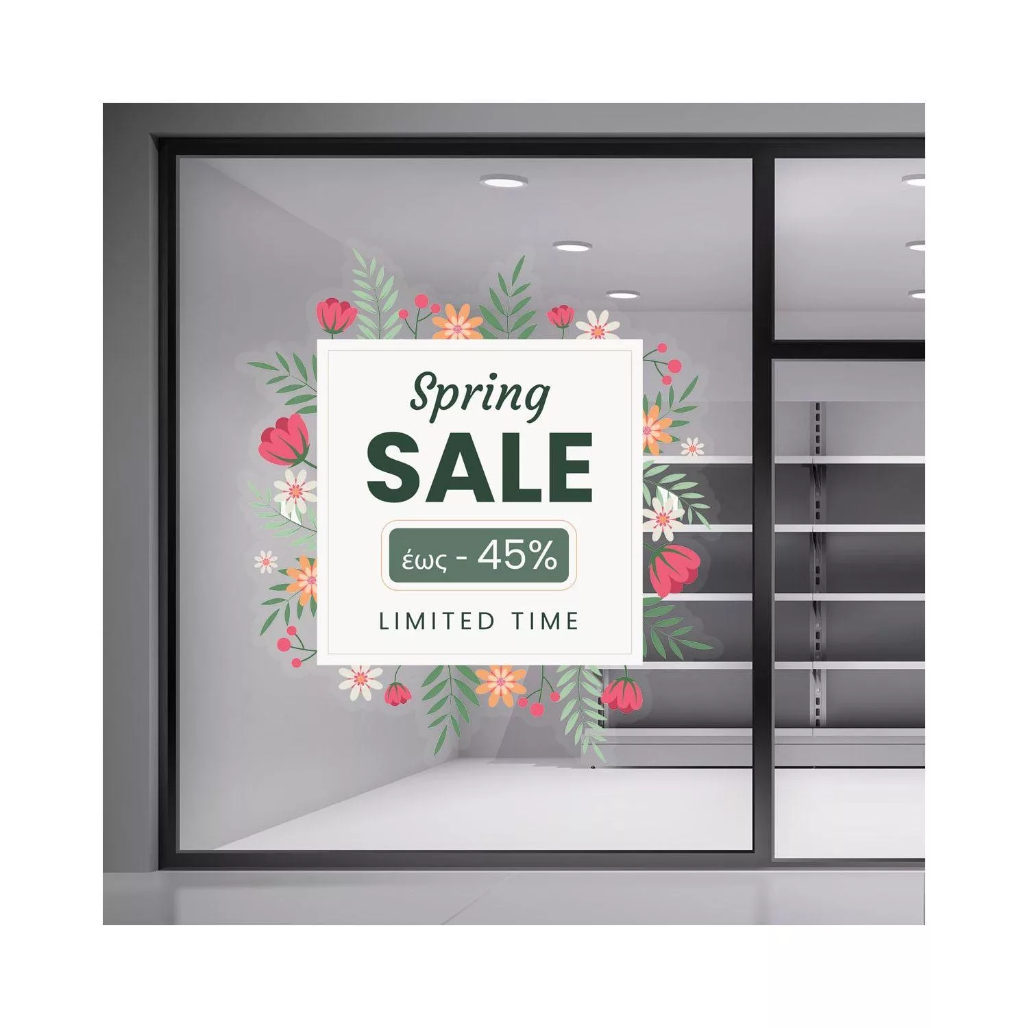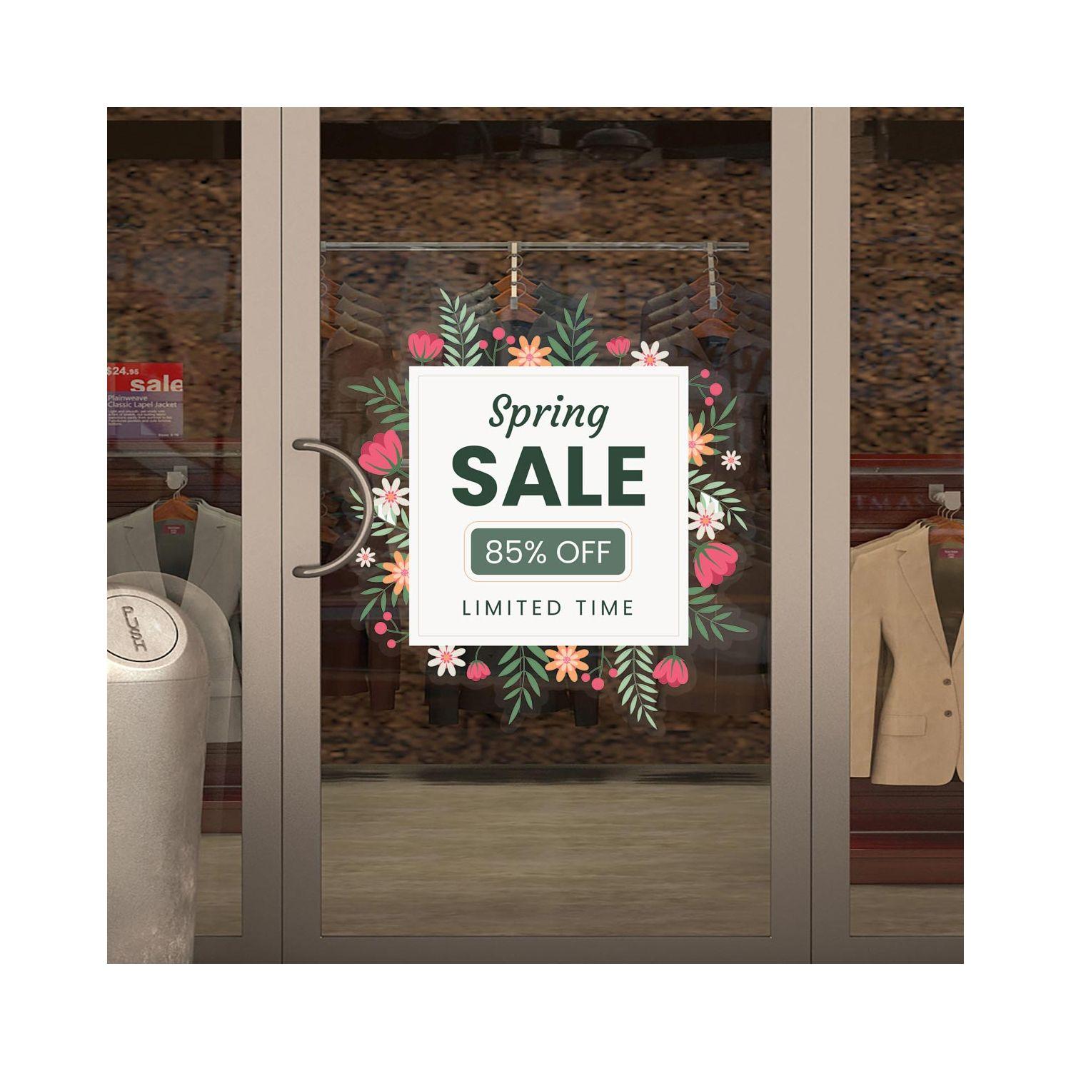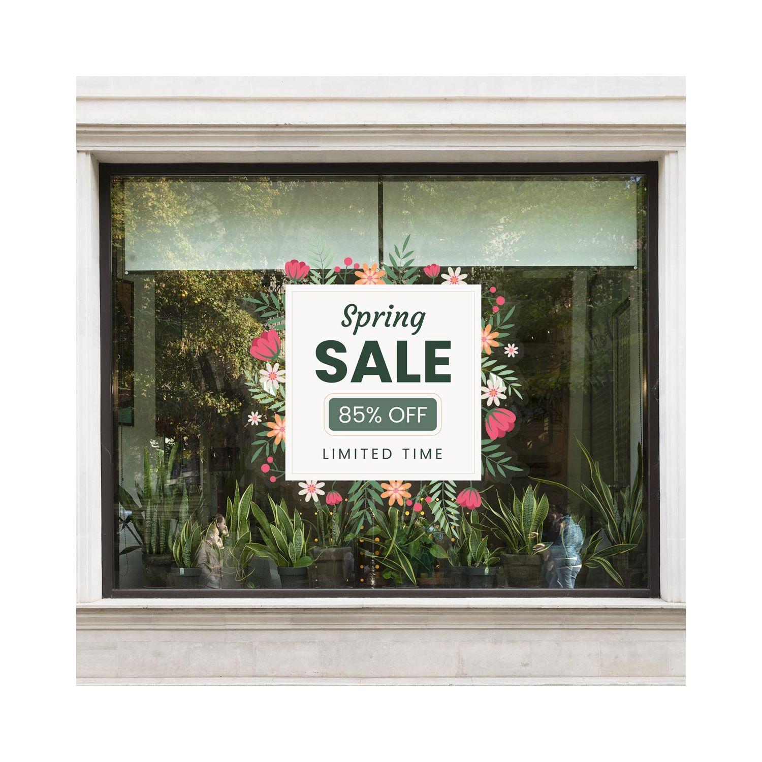 Αυτοκόλλητο βιτρίνας Spring Sale με ανθισμένα λουλούδια για εντυπωσιακή ανοιξιάτικη διακόσμηση και προώθηση των εκπτώσεων στο κατάστημά σας.
